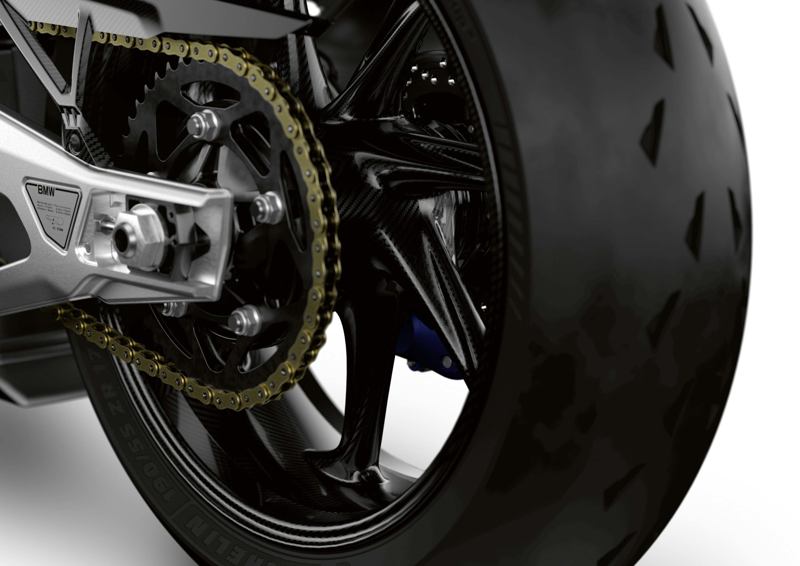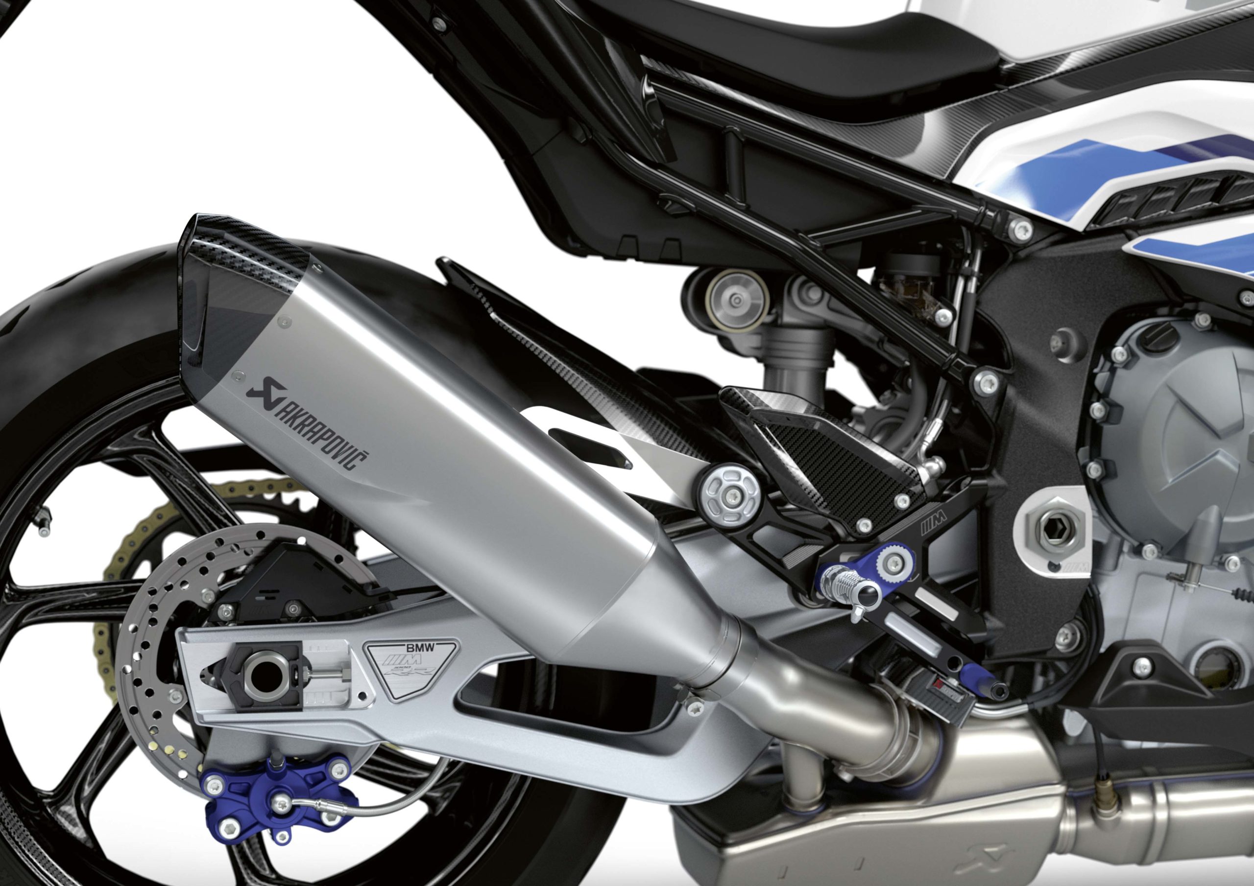 Moving rearward, those looking closely at the M1000RR swingarm will see that it has been modified as well, and is now 220 grams lighter. The rear brake mount has also been moved, to under the rear wheel, which should make wheel swaps much easier.