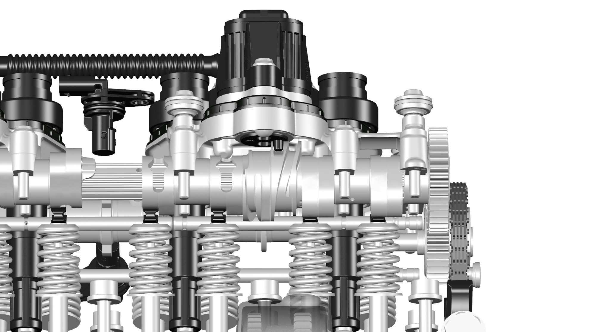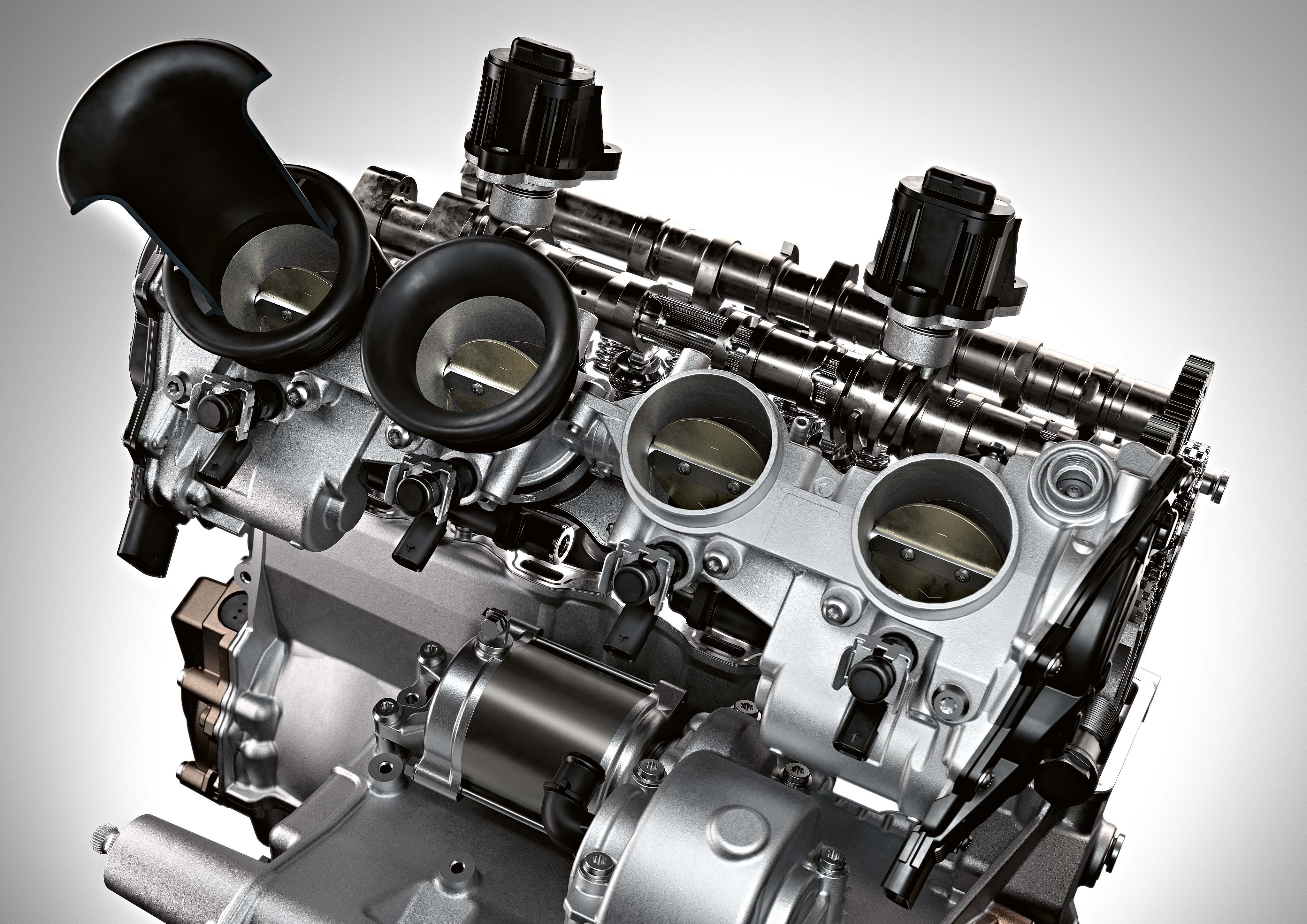 The 998cc inline-four engine is an all-new design, and it weighs over 8 lbs less than its predecessor. The most obvious feature is the new BMW ShiftCam Technology, which brings variable valve timing and valve stroke to the intake side of the valve train. BMW also says that it has revised the geometry of the intake and exhaust ports for optimization.