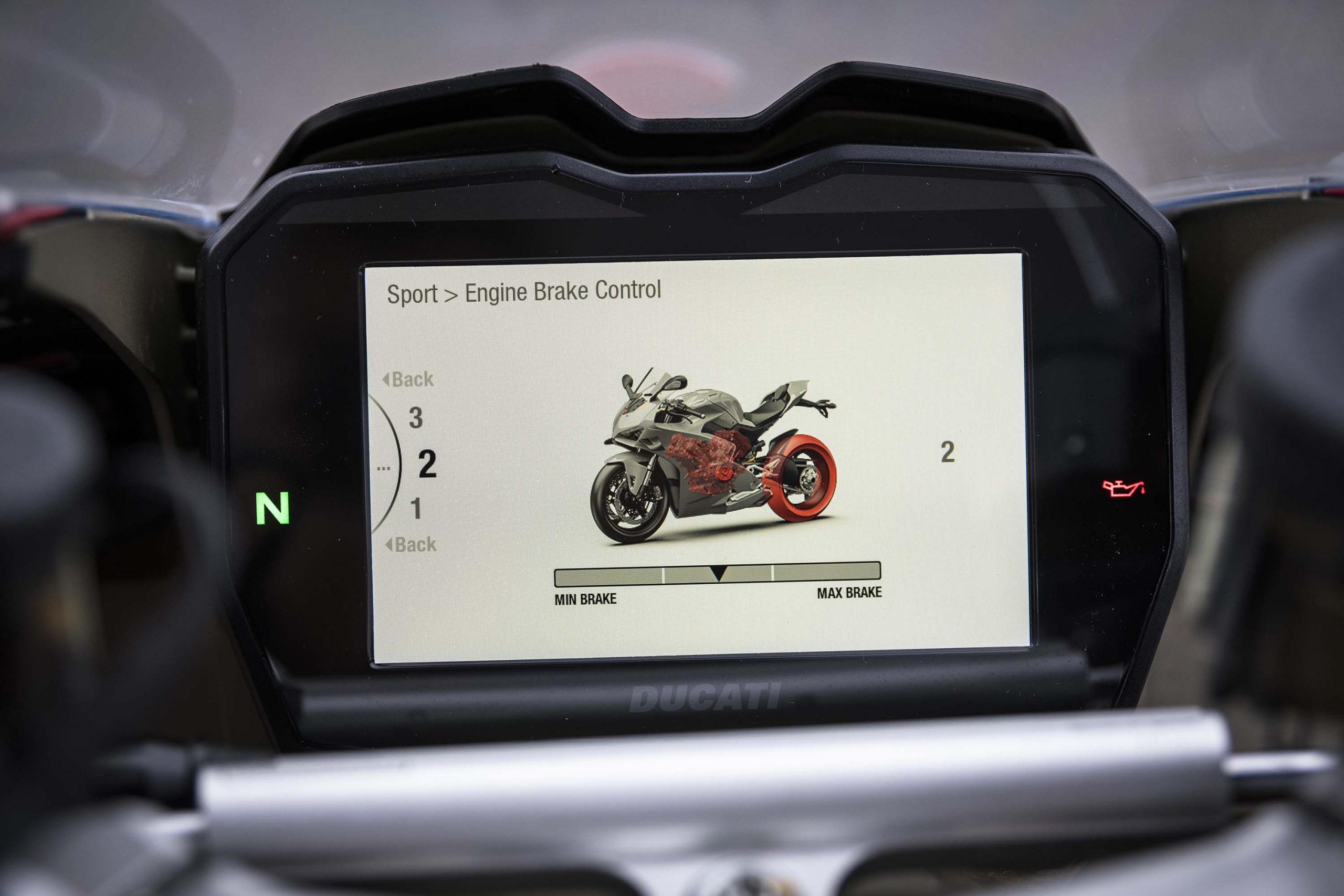 Easier to read is the four different electronics settings that are switchable while riding: traction control, wheelie control, slide control, and engine brake control.