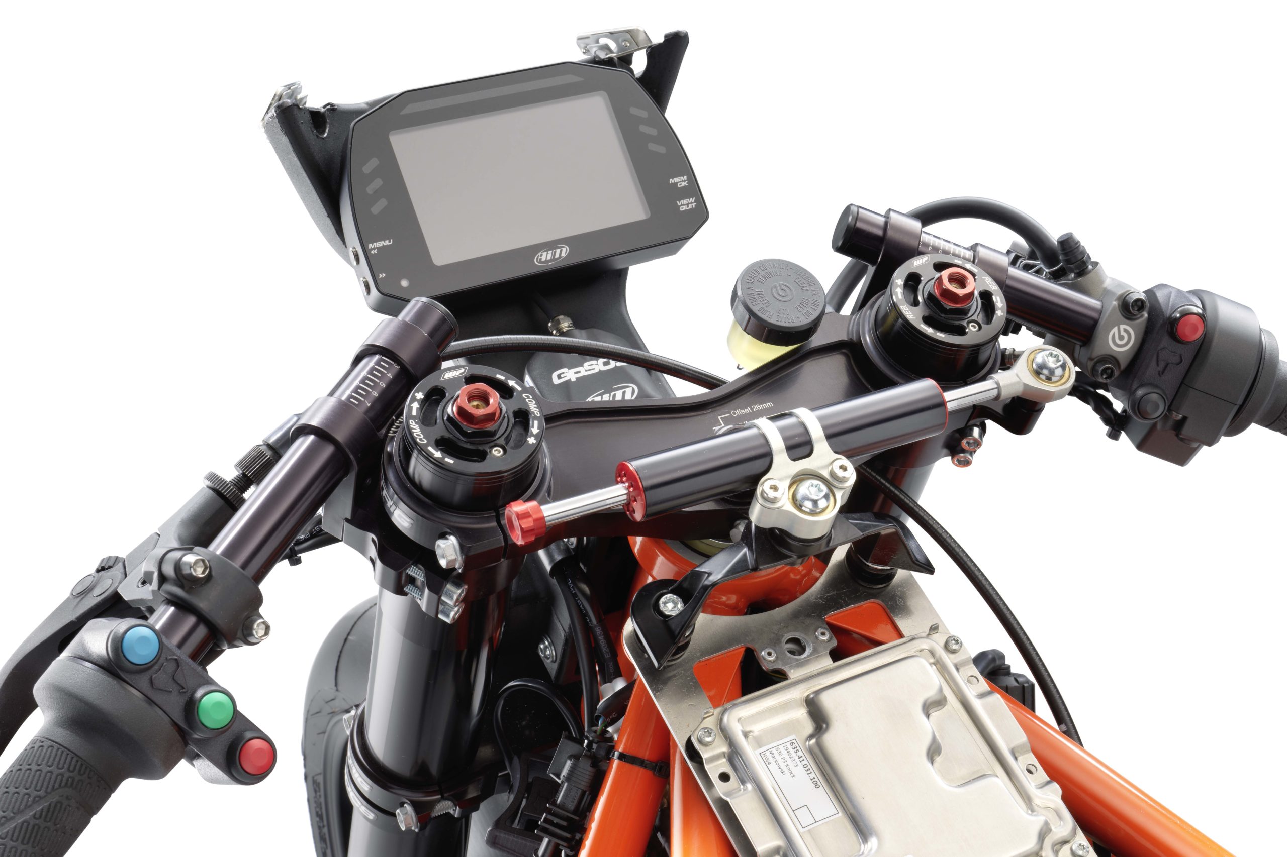 We can see more easily here the crash bobbins that are mounted to the frame on a three-pointed plate, which helps distribute around the frame the impact forces of a crash, thus helping to avoid a bent chassis during a high-speed off.